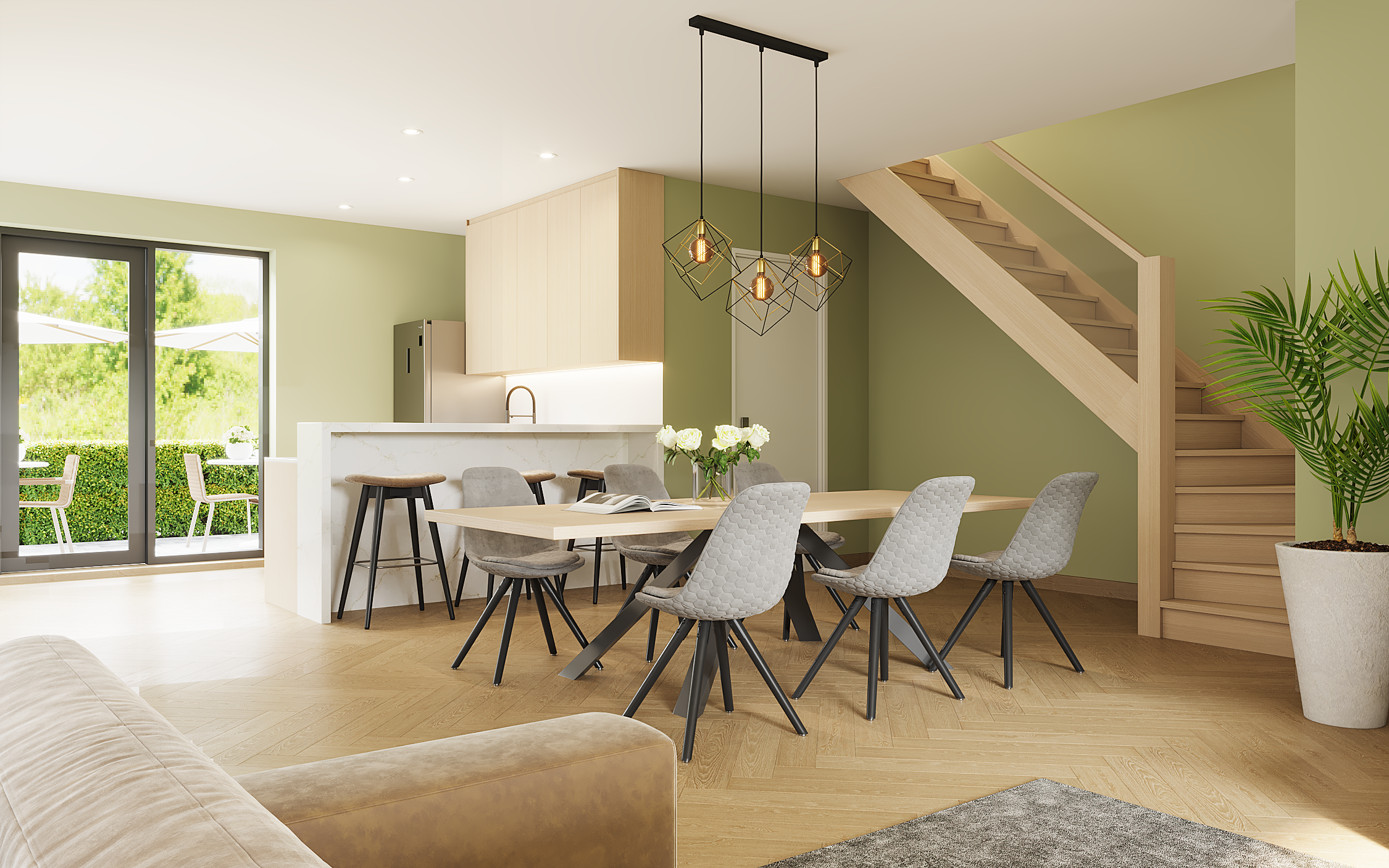 - Ruimte voor een royale woonkeuken met kookeiland of uitgebreide keukenset-up